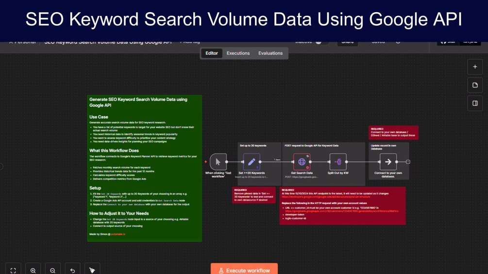 This n8n workflow is designed to generate comprehensive SEO keyword search volume data using the Google Ads API. It takes a list of keywords as input and retrieves monthly search volume, historical trends, keyword difficulty scores, and competition metrics from Google Ads. The processed data is then intended to be outputted to a database or other storage of your choice.